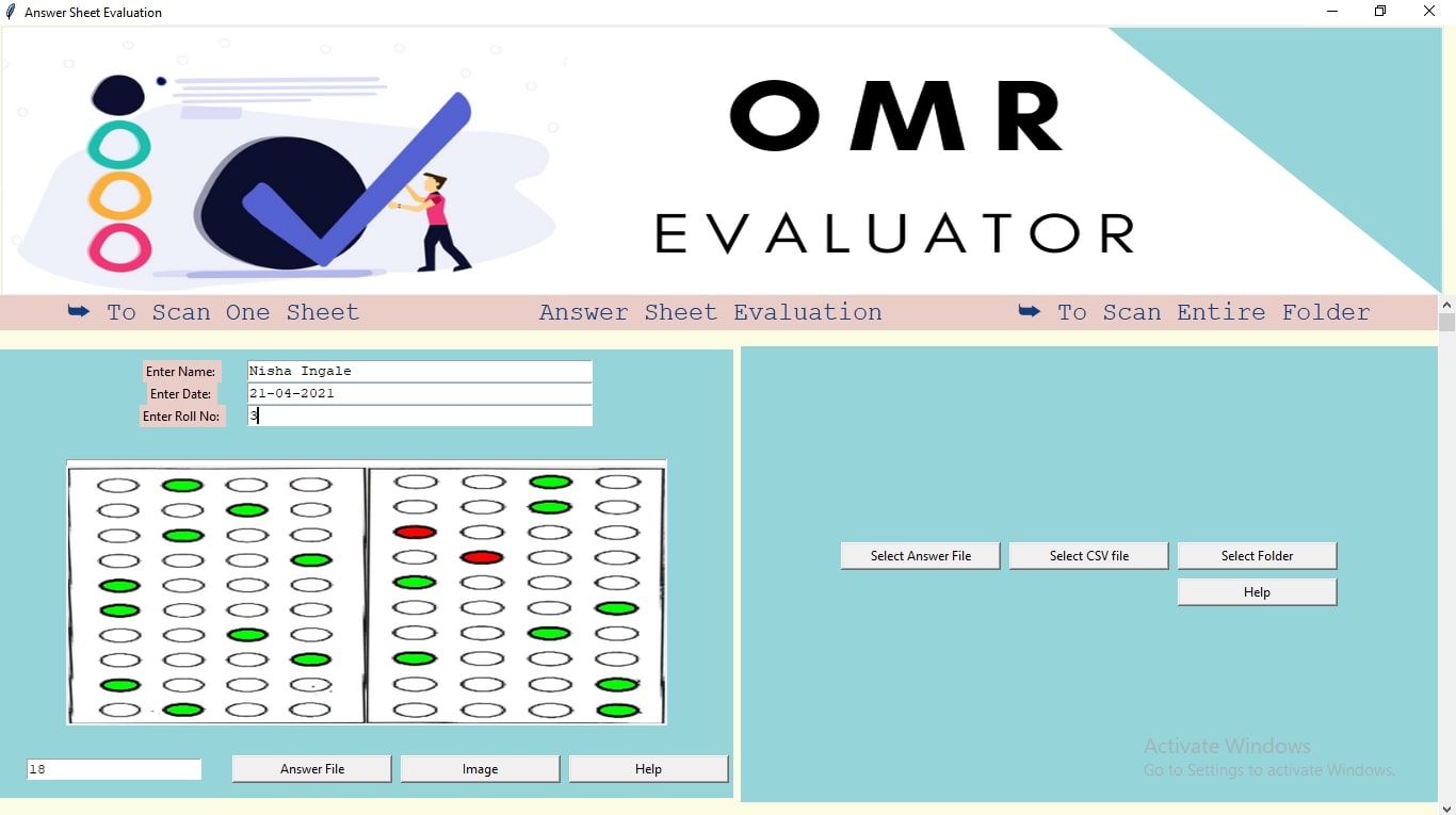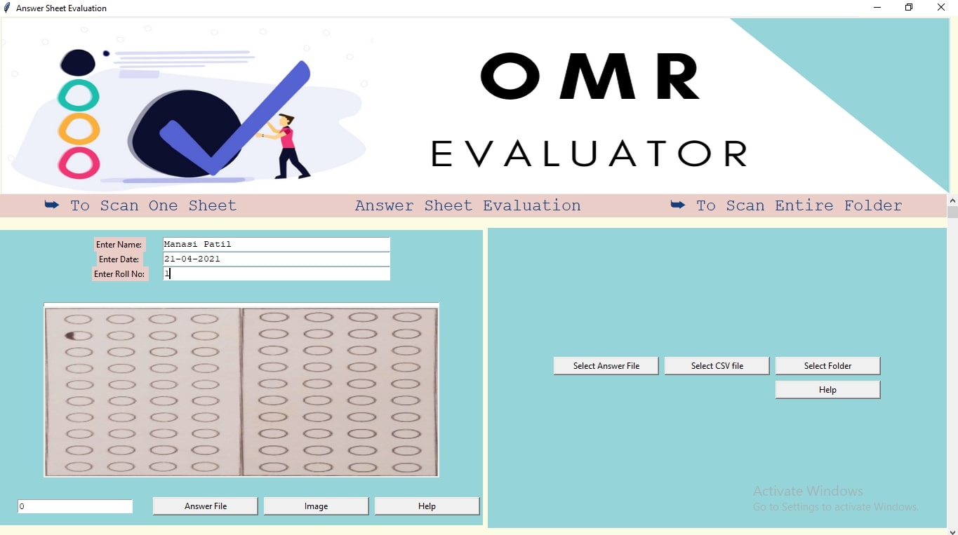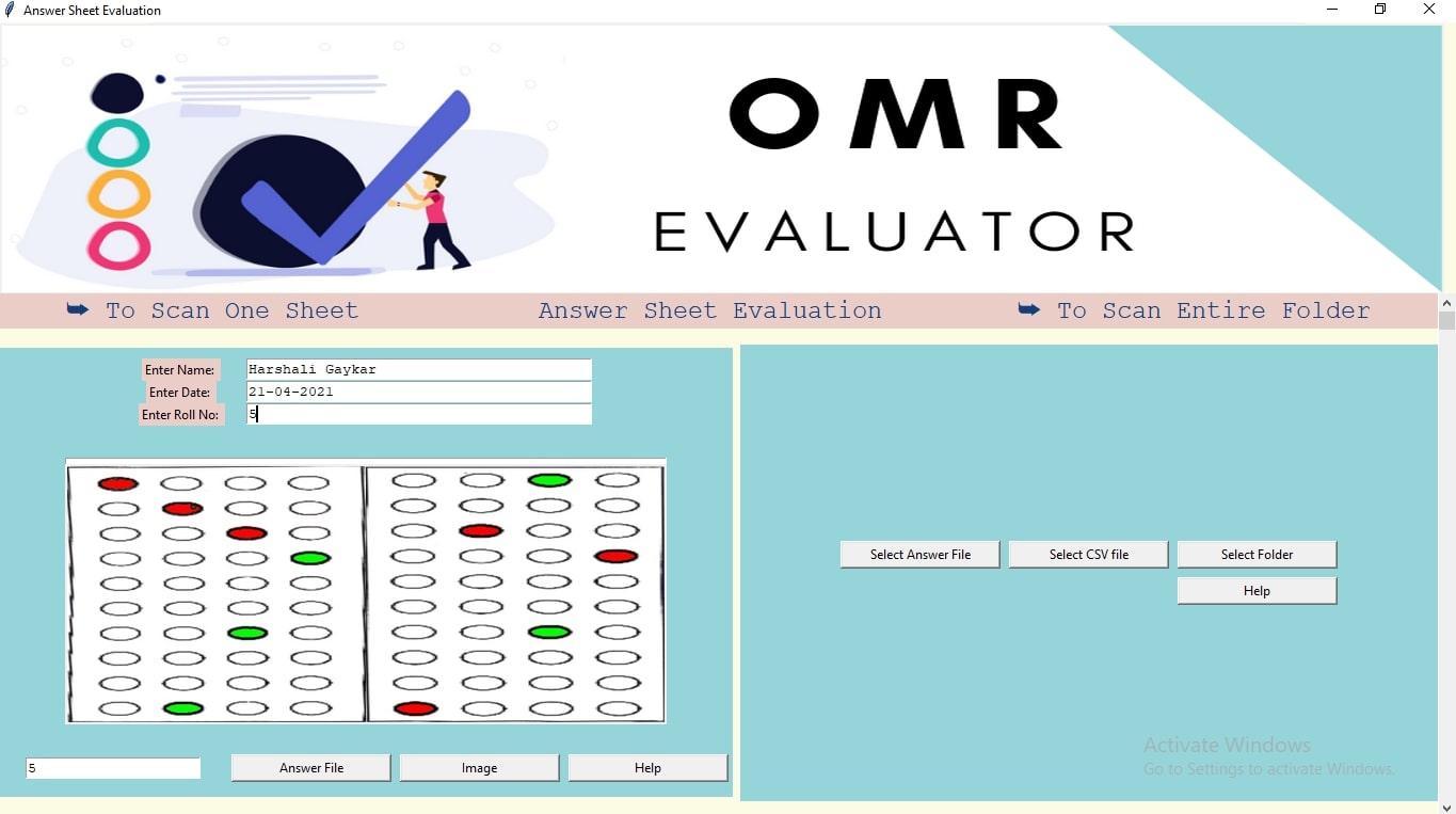 ๐ptical Mark Recognition (OMR) sheets are commonly used for grading purposes worldwide. This project offers a precise and cost-effective system for evaluating OMR sheets. The system accurately calculates the results and stores them in a CSV file based on the image and answers provided by the user. The user can choose to scan one sheet at a time or an entire folder as per their requirement.