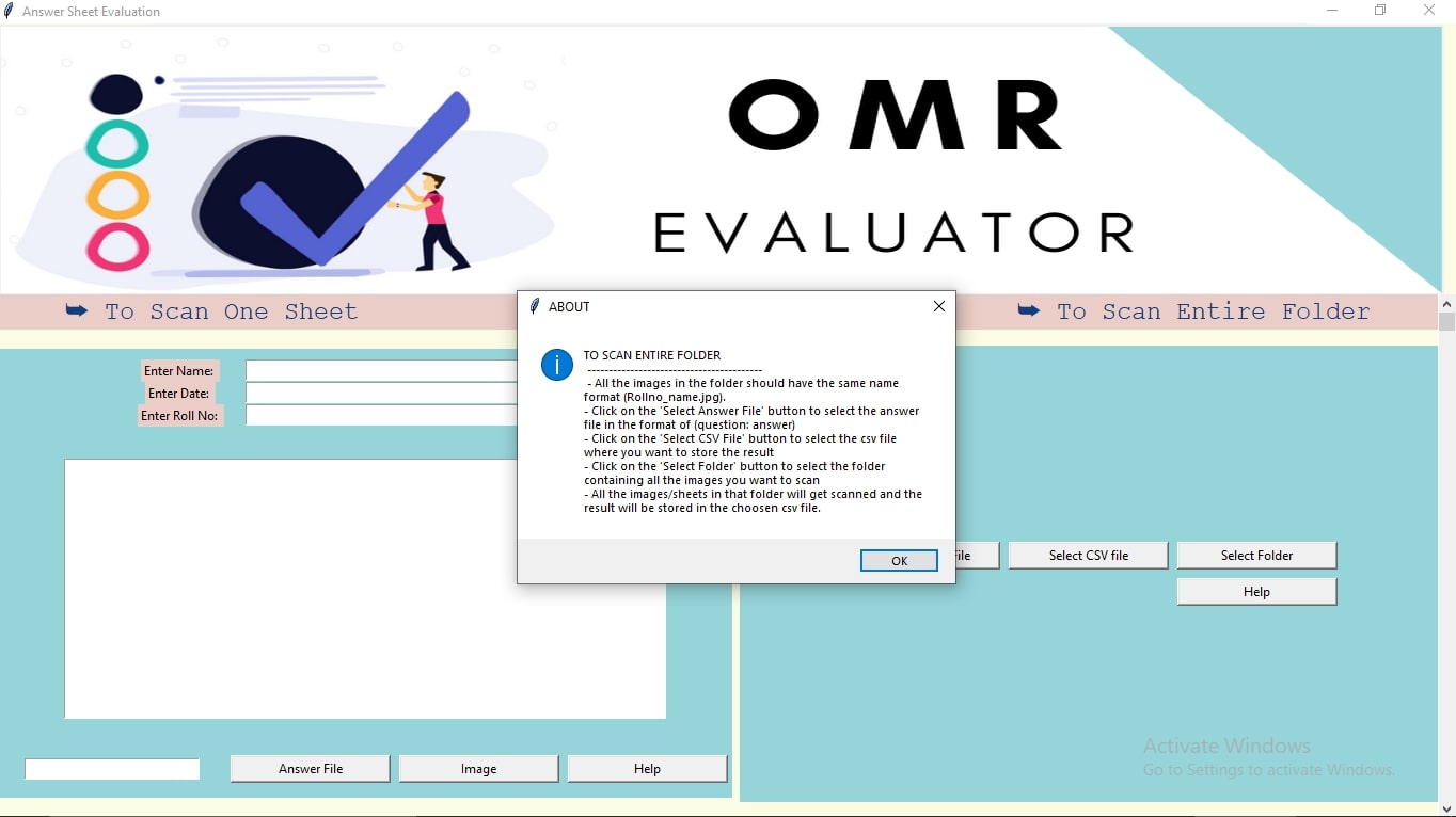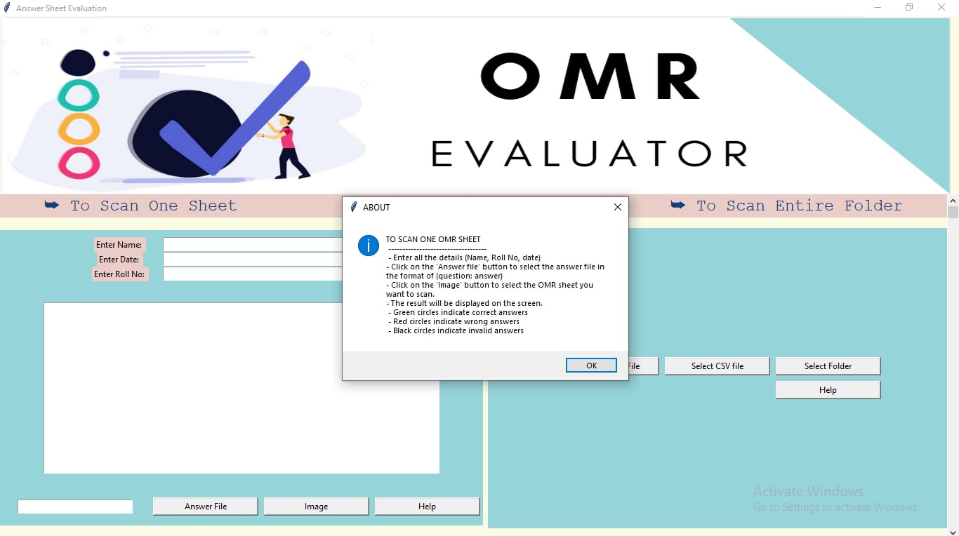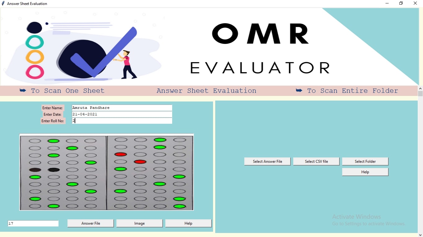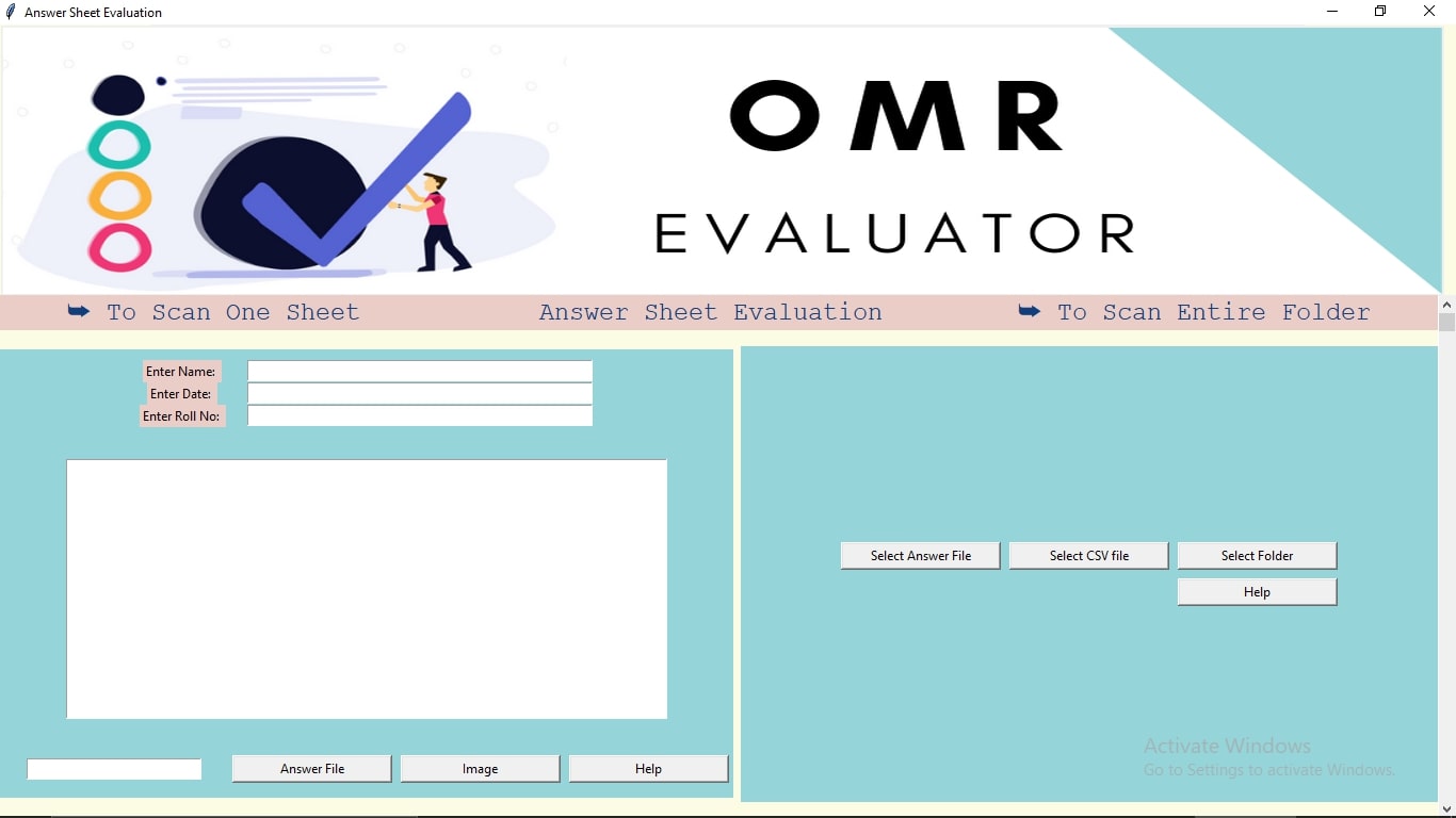 ๐ptical Mark Recognition (OMR) sheets are commonly used for grading purposes worldwide. This project offers a precise and cost-effective system for evaluating OMR sheets. The system accurately calculates the results and stores them in a CSV file based on the image and answers provided by the user. The user can choose to scan one sheet at a time or an entire folder as per their requirement.